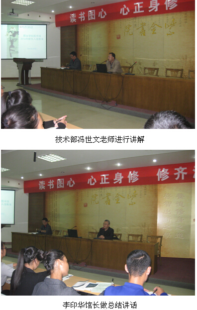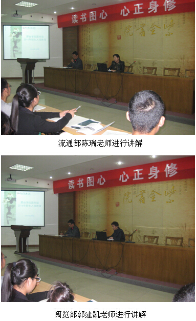 首先,由图书馆窦建爽老师主要从图书馆概况、借阅流程及规则、电子期刊使用及各注意事项等几个方面向新生做了详细的讲解,使大家对图书馆有了一个相对直观的印象,也对如何更好地利用图书馆有了进一步认识。随后,流通部陈瑞老师、阅览部郭建凯老师和技术部冯世文老师分别对各自部门的具体职责做了简要介绍,并对大家经常遇到的问题和相关注意事项做了详细说明。